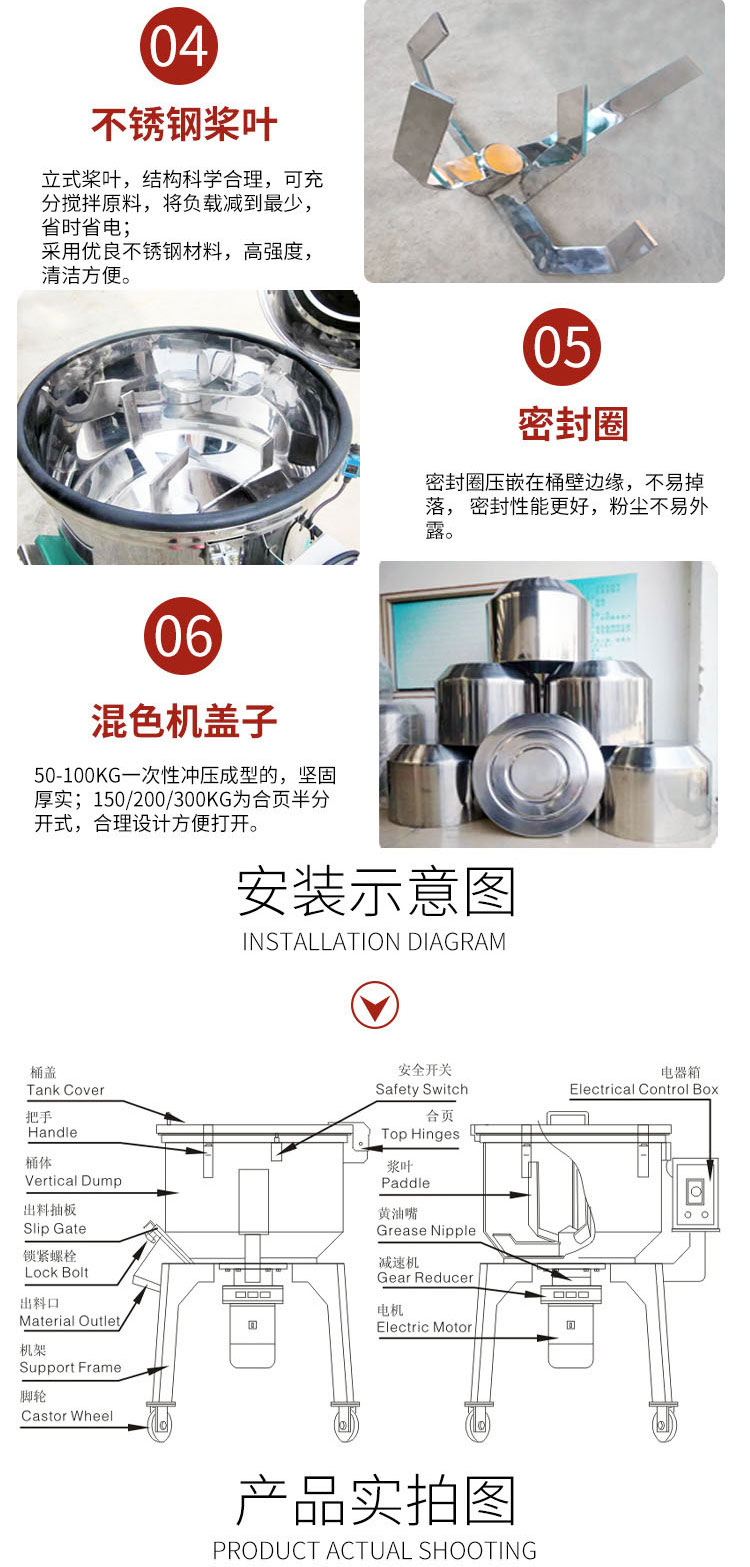 3、 短時間內(nèi)完成均勻混料、低耗能、高效率;